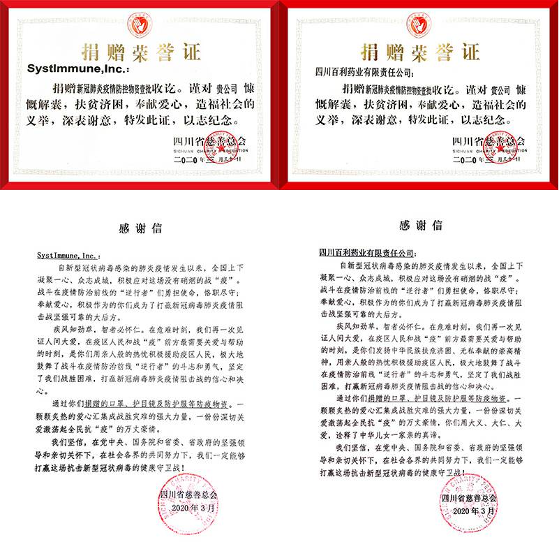 金年会官网-金年会(中国)一站式服务官网携手美国西雅图免疫,中美企业共同通过四川慈善总会,向四川和湖北等一线医院分批次捐赠医用外科口罩和N95口罩、护目镜、防护服等防护用品。向全国几十家医院捐赠抗病毒药物新博林(利巴韦林颗粒)和提高免疫的好好黄芪颗粒等,助力一线医护抗疫
